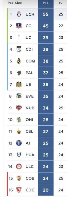 El Romantico Viajero llegó a 55 puntos, distanciándose a 10 unidades de Colo-Colo quien suma tres fechas pendientes, pero que hasta el momento no influye en el devenir azul ya que siguen dependiendo de sí mismos para lograr bajar su estrella número 19.