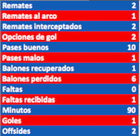 Gustavo Canales ingresó desde el arranque y se notó, metió varios balones con ventaja, supo hacer la pausa antes de dar pases e hizo un gol, todo ello aseguró un rendimiento brillante del trasandino. Sus números lo comprueban a continuación: