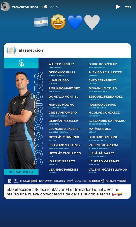 Asimismo, Taty Castellanos actualmente es una de las figuras del Lazio de la Serie A de Italia, y tuvo un impactante renacer futbolístico, por lo que será considerado como alternativa en un ataque de la Selección Argentina que cuenta con figuras como Lautaro Martínez o Julián Álvarez.