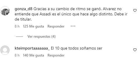 “Gracias a su cambio de ritmo se ganó. Álvarz no entiende que Assadi es el único que hace algo distinto. Debe ir de titular”, “Denle más minutos”, “Luquitas tiene que ser Messi para que el profe lo ponga de titular” o “Profe y si lo ponemos desde el principio, quizás no terminamos infartados en el minuto 90”, son algunas de las reacciones de los hinchas de la U tras la gran actuación de Lucas Assadi.
