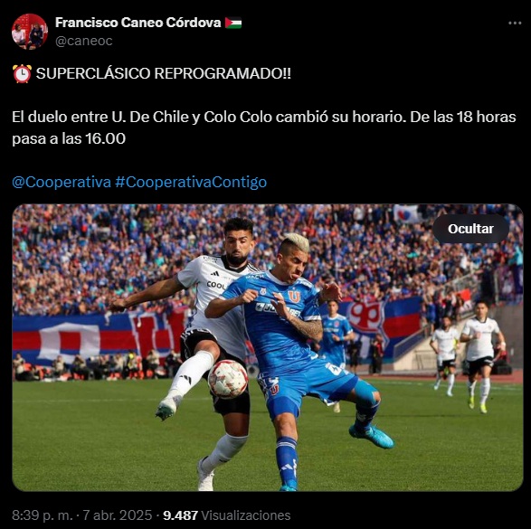 “Superclásico reprogramado. El duelo entre U de Chile y Colo-Colo cambió de su horario. De las 18:00 horas pasa a las 16:00 horas”, fue lo señalado por el comunicador respecto al partido entre el Chuncho y los albos.