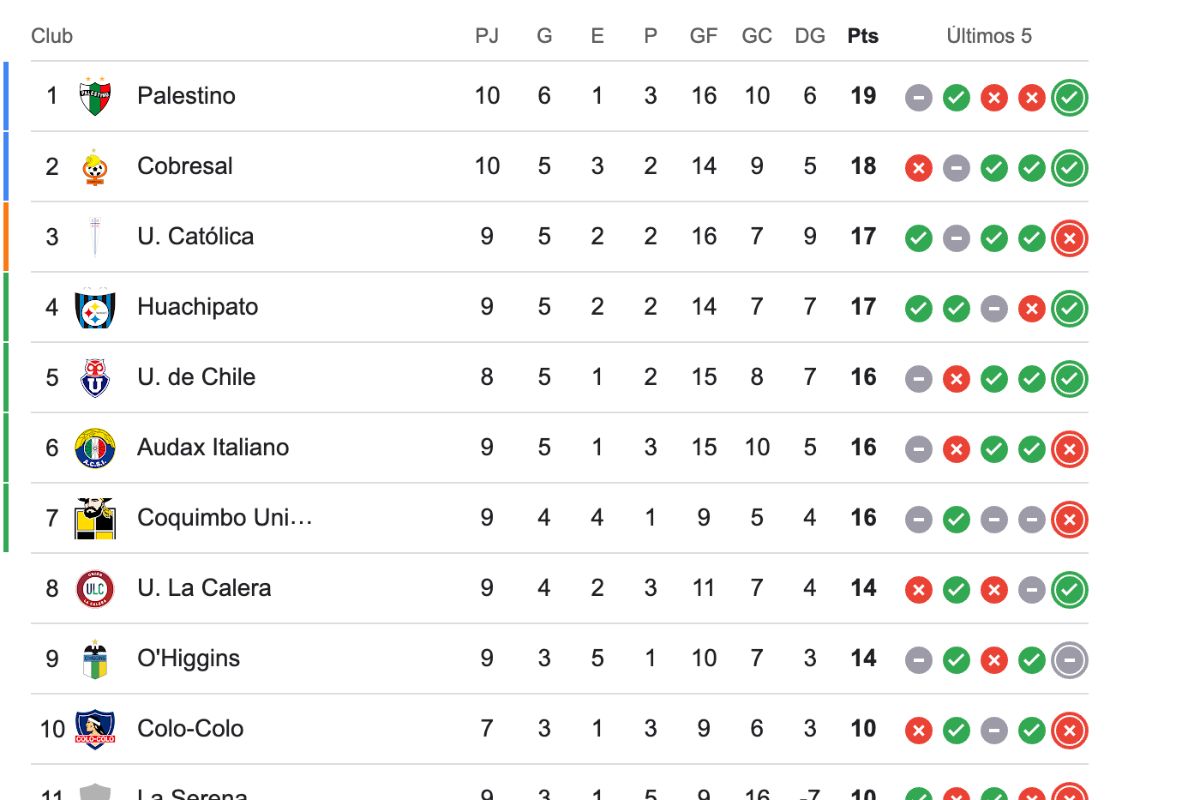 Por el momento, cabe señalar que tras los partidos disputados en la fecha 10, Palestino es el primer lugar (19), seguido de Cobresal (18) y luego Universidad Católica (17).
