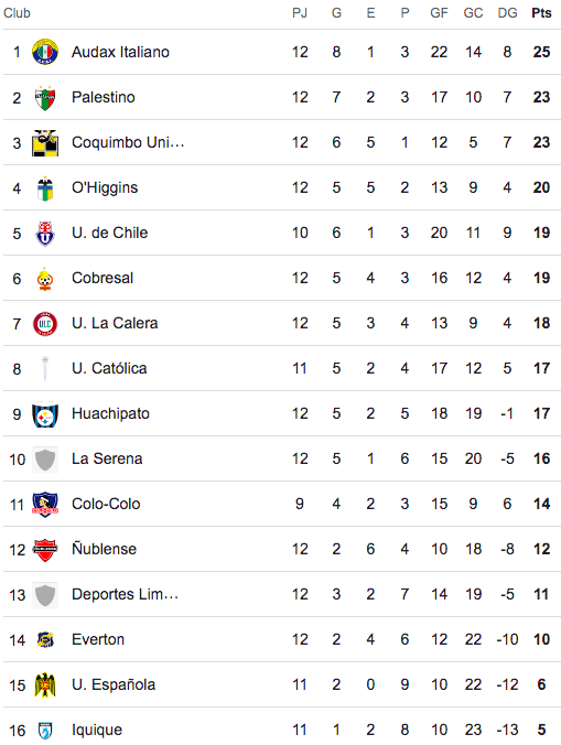 El puntapié inicial de la fecha 12 llegó con la caída de Universidad de Chile por 2-0 frente a Deportes Limache. Tras ello, el sábado Everton igualó por 2-2 con Cobresal, Colo-Colo se impuso por 4-1 sobre Unión Española y Coquimbo Unido empató sin goles con Palestino.