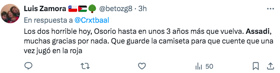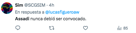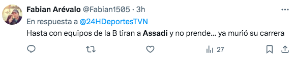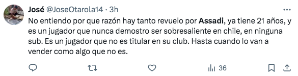El resultado gatilló la salida de Ricardo Gareca del combinado nacional, que saltó a la cancha con dos jugadores de Universidad de Chile; uno de ellos es Lucas Assadi, quien recibió una serie de críticas por su desempeño. A través de redes sociales, varios hinchas arremetieron contra el nivel del canterano azul, cuestionamientos que también recibió Darío Osorio.